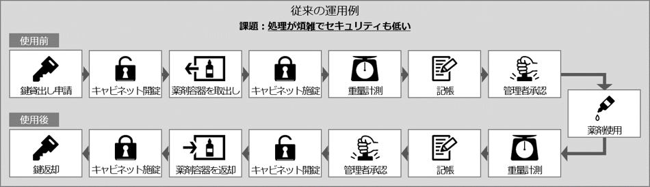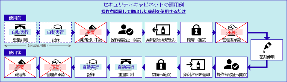 セキュリティキャビネットは、ユーザー認証から物品の出し入れまで切れ目のないセキュリティを実現、ICタグと重量で「誰が」「何を」「どれだけ」使ったかを同時に管理することができます。